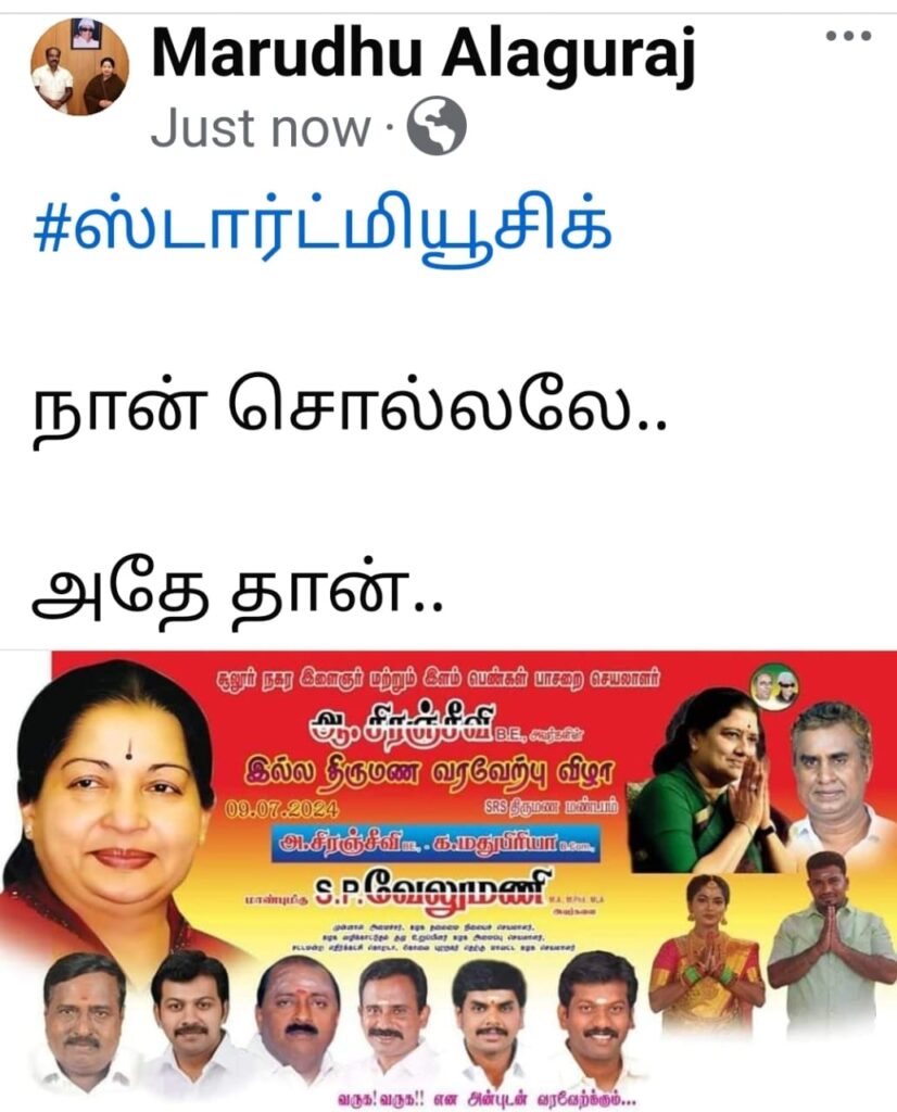 அதாவது சசிகலா பக்கத்தில் எஸ்.பி.வேலுமணியின் புகைப்படத்தை வைத்து அந்த போஸ்டர் இருக்கிறது. ‘ஸ்டார்ட் மியுசிக்…. நான் சொல்லலே… அதே தான்…’ என சூசகமாக பதிவிட்டிருக்கிறார்.