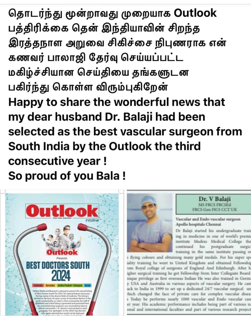 இந்த நிலையில்தான் இவரது கணவர் டாக்டர் பாலாஜி மருத்துவத்துறையில் மிகவும் நேர்த்தியாகவும், சிறப்பாகவும் பணியாற்றக்கூடியவர். தொடர்ந்து மூன்றவாது முறையாக ‘அவுட் லுக்’ பத்திரிகை தென் இந்தியாவின் சிறந்த இரத்த நாள அறுவை சிகிச்சை நிபுனராக தேர்வு செய்திருக்கிறது. இந்த மகிழ்ச்சியான செய்தியை தனது வலைதளப் பக்கத்தில் பதிவிட்டிருக்கிறார் முன்னாள் அமைச்சர் பூங்கோதை ஆலடி அருணா!