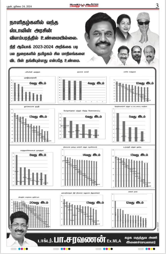 அதேபோல் விடியா திமுக அரசின் முதலமைச்சர் ஸ்டாலின் நிதி ஆயோக் அறிக்கையில் தேசிய சராசரியை ஒப்பிட்டு, அதில் தமிழகம் தேசிய சராசரி காட்டிலும் அதிக மதிப்பீடு பெற்றதாக விளம்பரபடுத்தி வருகிறார் ஆனால் உண்மை என்னவென்றால் தேசிய சராசரியை காட்டிலும் மற்ற மாநிலங்கள் தமிழ்நாட்டை காட்டிலும் மதிப்பீட்டை அதிமாக பெற்று முதலிடத்தில் உள்ளதை மறைத்து விட்டார்.
