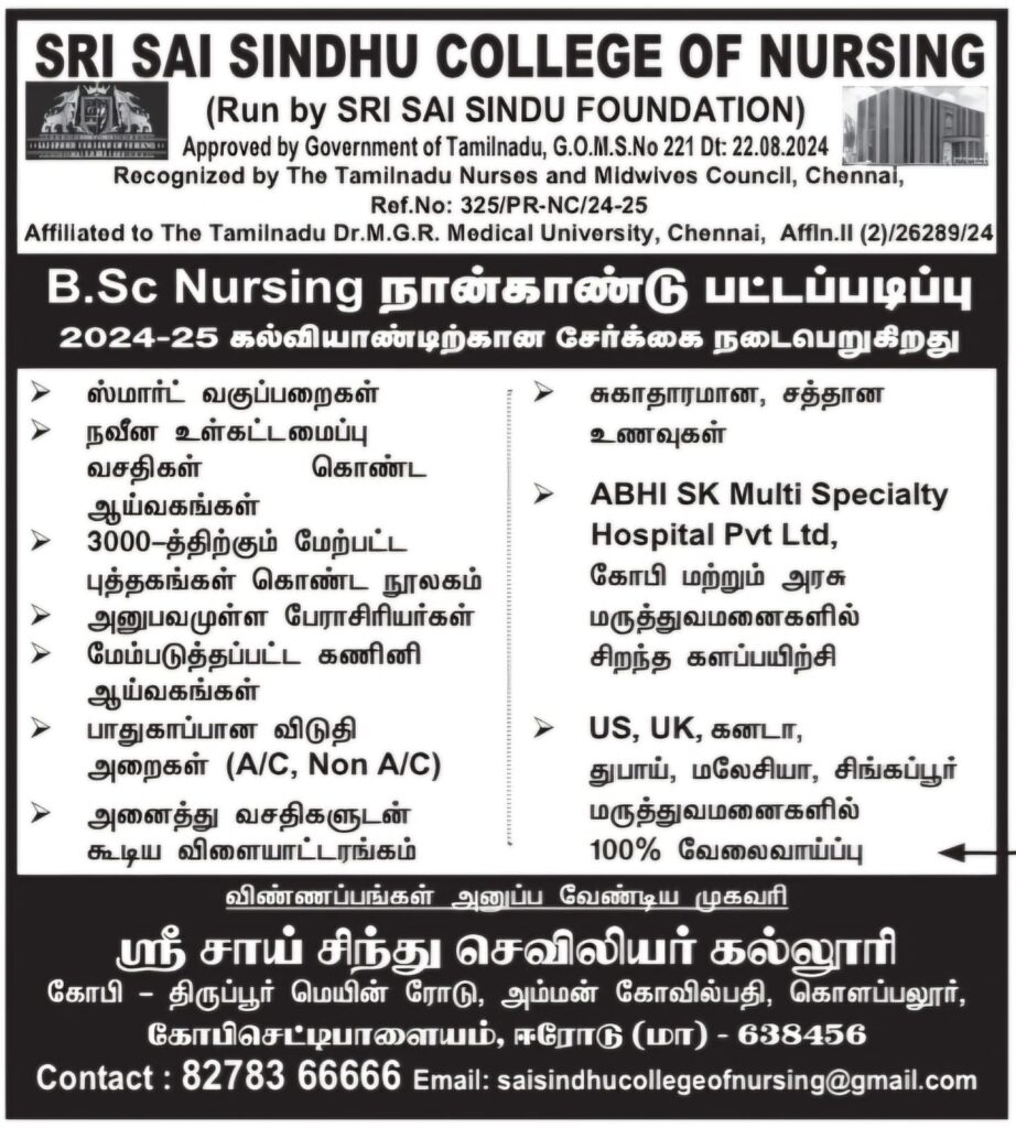 தமிழகத்தில் இன்றைக்கு ஏராளமான செவிலியர் கல்லூரிகள் இருக்கின்றனர். ஆனால், அதிநவீன உள்கட்டமைப்புடன், ஸ்மார்ட் வகுப்பறைகள், ஆய்வகங்களுடன் அமைந்திருக்கிறது ஸ்ரீ சாய் சிந்து செவிலியர் கல்லூரி. இக்கல்லூரி கோபி செட்டிப்பாளையம் & திருப்பூர் மெயின் ரோட்டில் அமைந்திருக்கிறது.